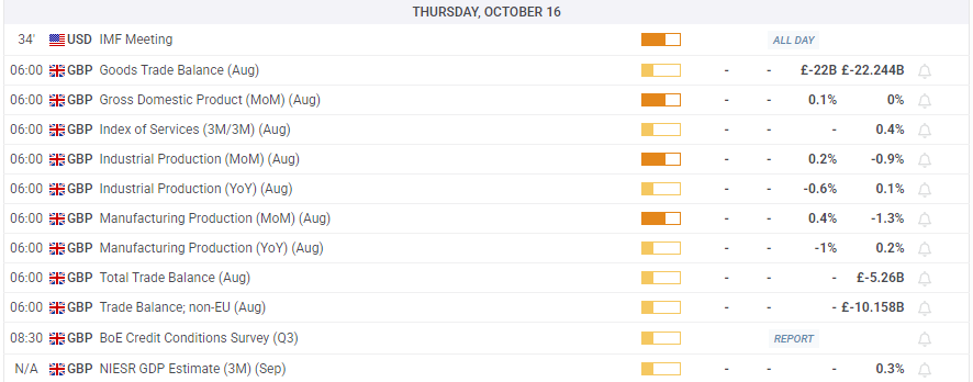 预计将发布8月份的英国国内生产总值(GDP)增长、工业和製造业生产以及英国贸易平衡数据,侭管每个单独的数字充其量只是中等重要,但如果整体出现显著的下行或上行趋势,可能会导致日内英镑/美元流动的剧烈变化。