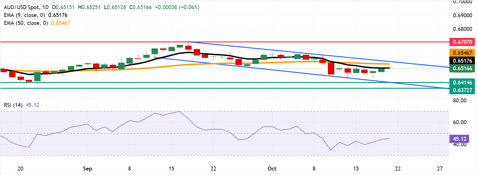 AUD/USD货币对正在测试九日指数移动平均缐(EMA)0.6517的即时阻力,随后是50日EMA的0.6546和下降通道的上边界约0.6570。