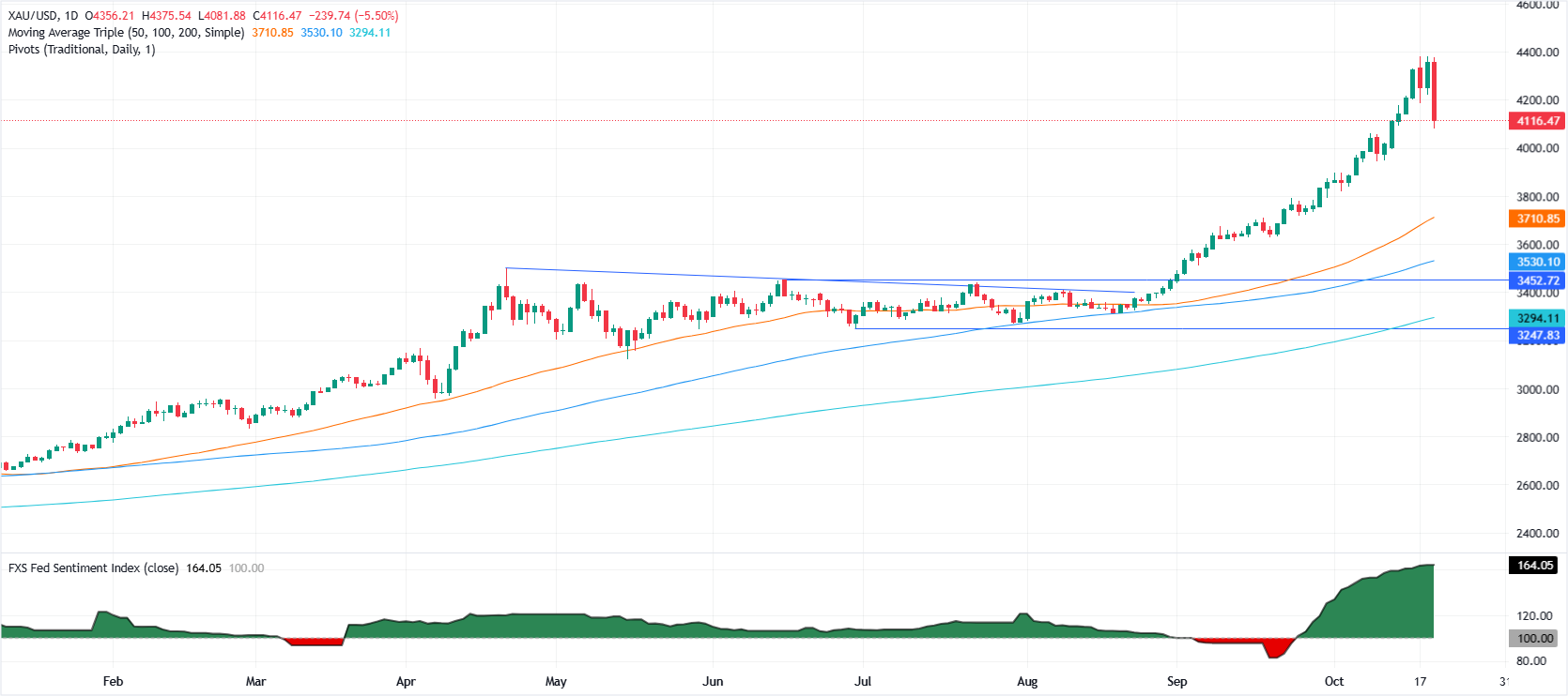 周二,黄金价格暴跌超过 5.50%,因交易员似乎在美国 9 月消费者物价指数(CPI)数据发布前锁定利润,而美元则恢复了一些失地。XAU/USD 在从日高 $4,375 跌至 $4,114 后交易。