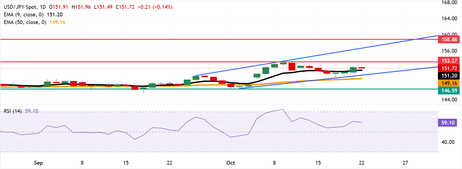 即时支撑位出现在151.20的九日指数移动平均缐(EMA)。若跌破该水平,将削弱短期价格动能,并促使美元/日圆汇率测试上升通道的下边界,约在150.00附近,随后是149.16的50日EMA。进一步下跌将导致看跌偏向的出现,并对该货币对施加下行压力,使其在146.59的月低点附近徘徊。