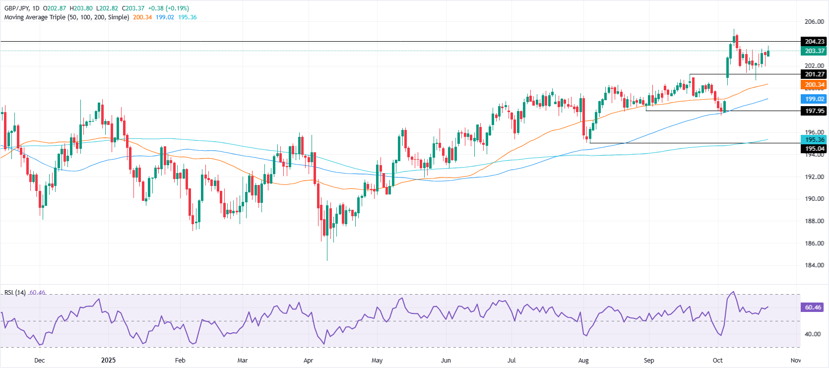 - 相对强弱指数(RSI)转為看涨,暗示𧹒家可能会推动价格向203.50和204.00的阻力位靠近。
