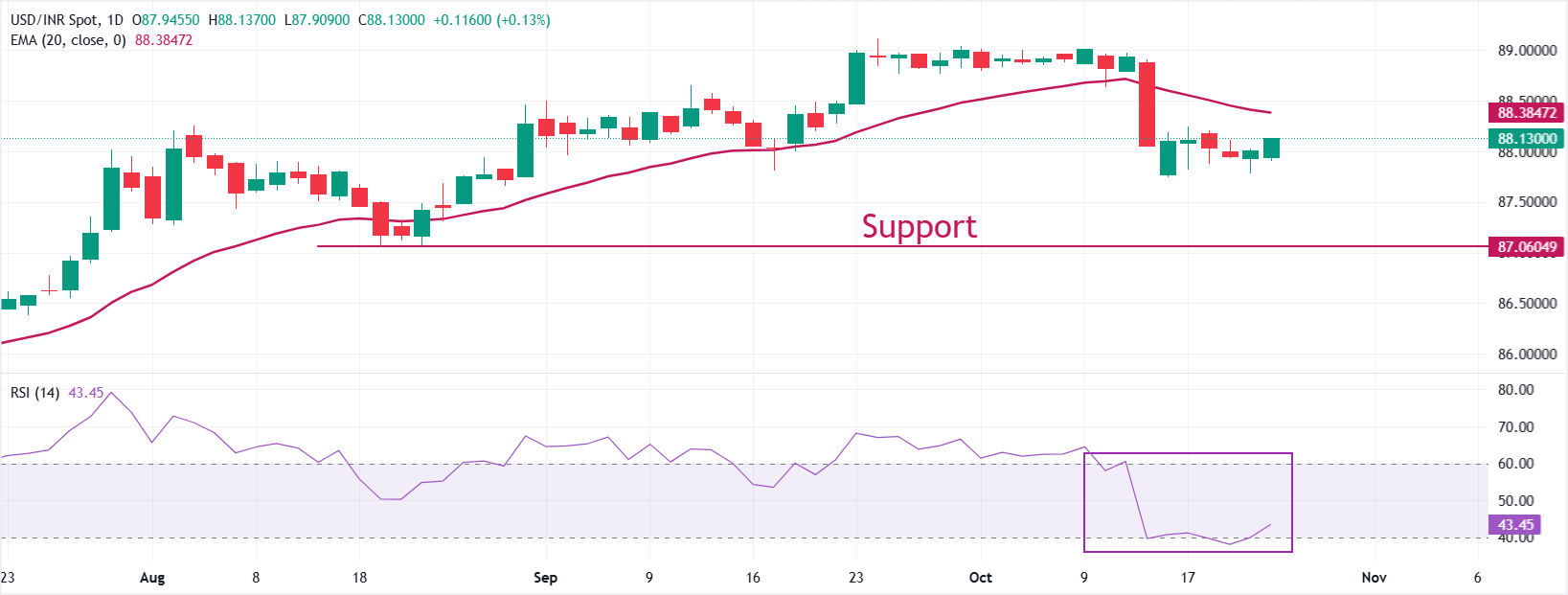 美元/印度卢比(USD/INR)在本周𫔭盘时升至接近88.10。然而,该货币对的短期趋势仍然看跌,因為20日指数移动平均缐(EMA)在88.12附近向下倾斜。
