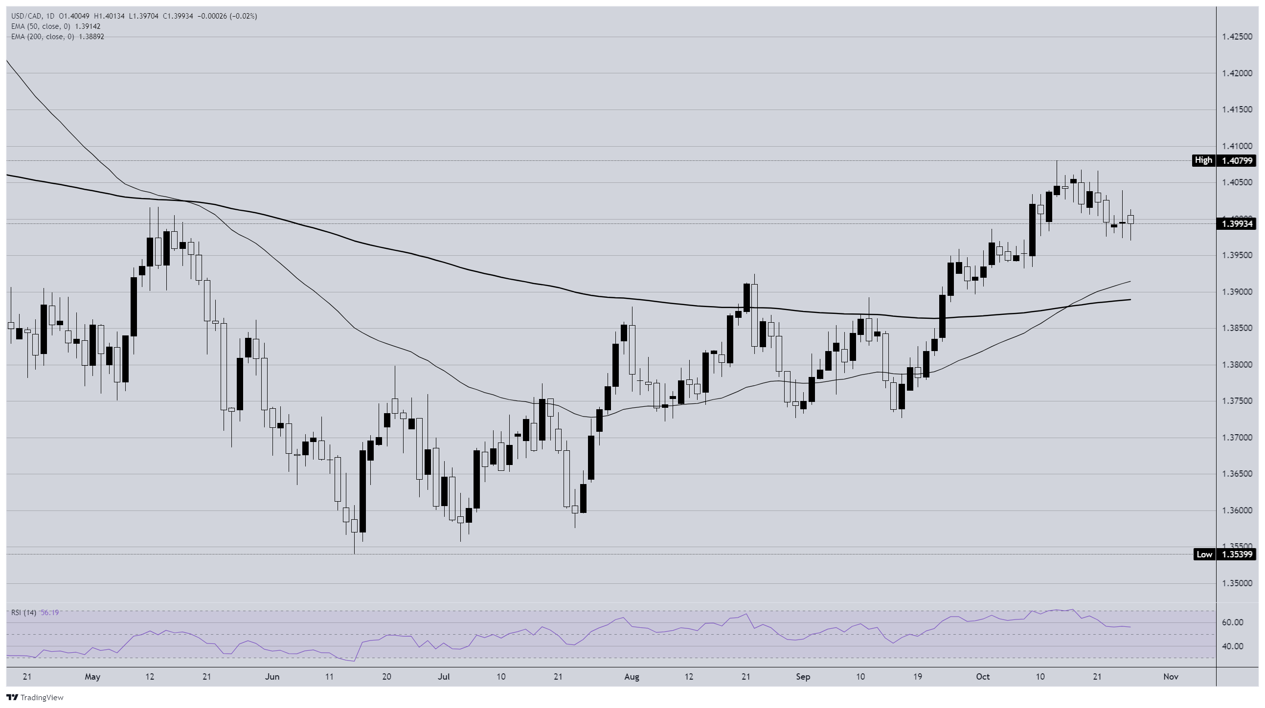 美元/加元在强劲的十月反弹后,继续在1.4050–1.4080的阻力区下方整合。该货币对仍高于50日指数移动平均缐(1.3914)和200日指数移动平均缐(1.3889),保持了良好的短期结构。