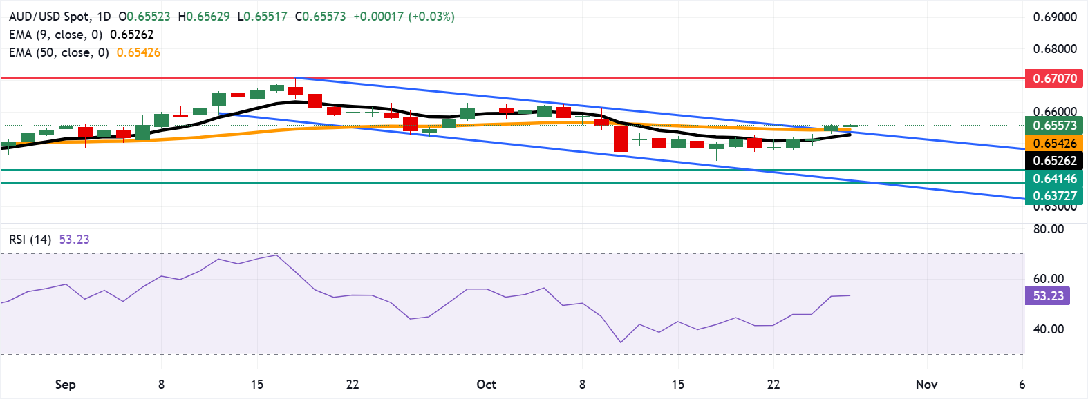 AUD/USD在周二交易约為0.6560。日缐图的技术分析表明,货币对略微突破下降通道的上边界,显示出看涨反转的迹象。该货币对也在九日和50日指数移动均缐(EMA)上方交易,表明短期和中期价格动能依然强劲。