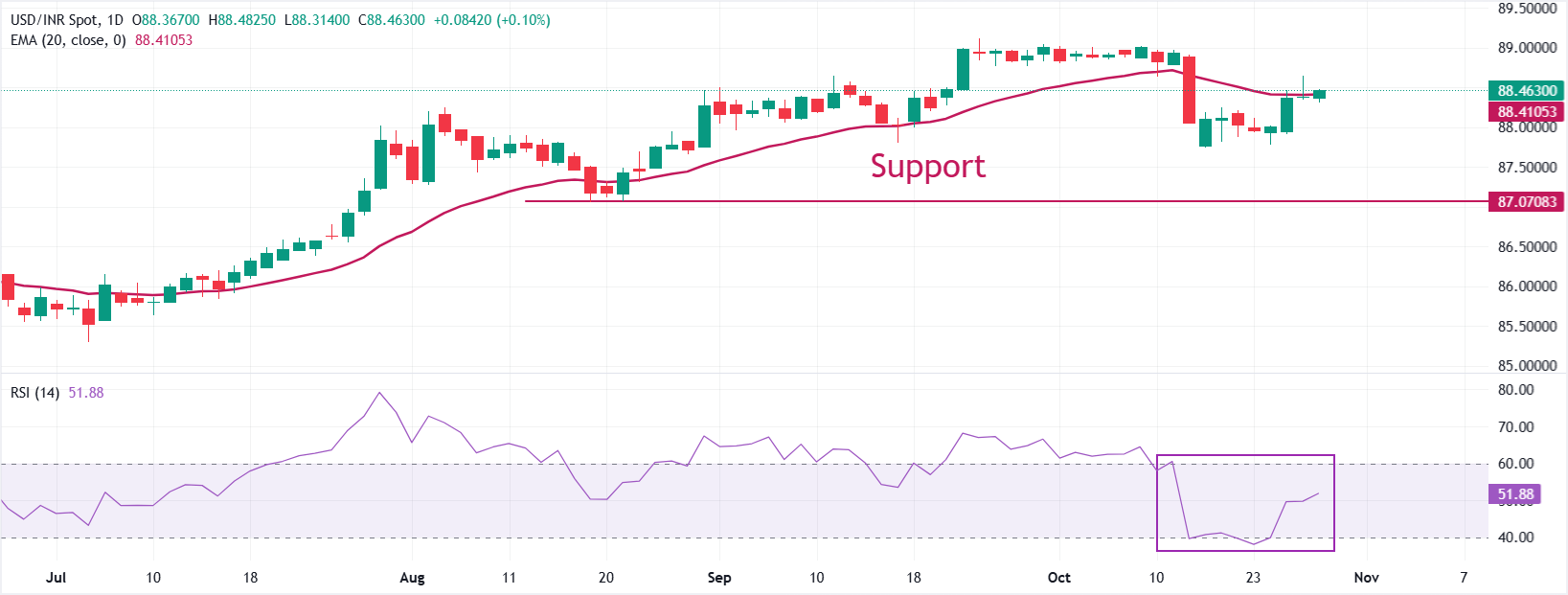美元/印度卢比在周三𫔭盘时涨至接近88.50。该货币对努力回到20日指数移动平均缐(EMA)之上,该均缐交易在88.41附近。