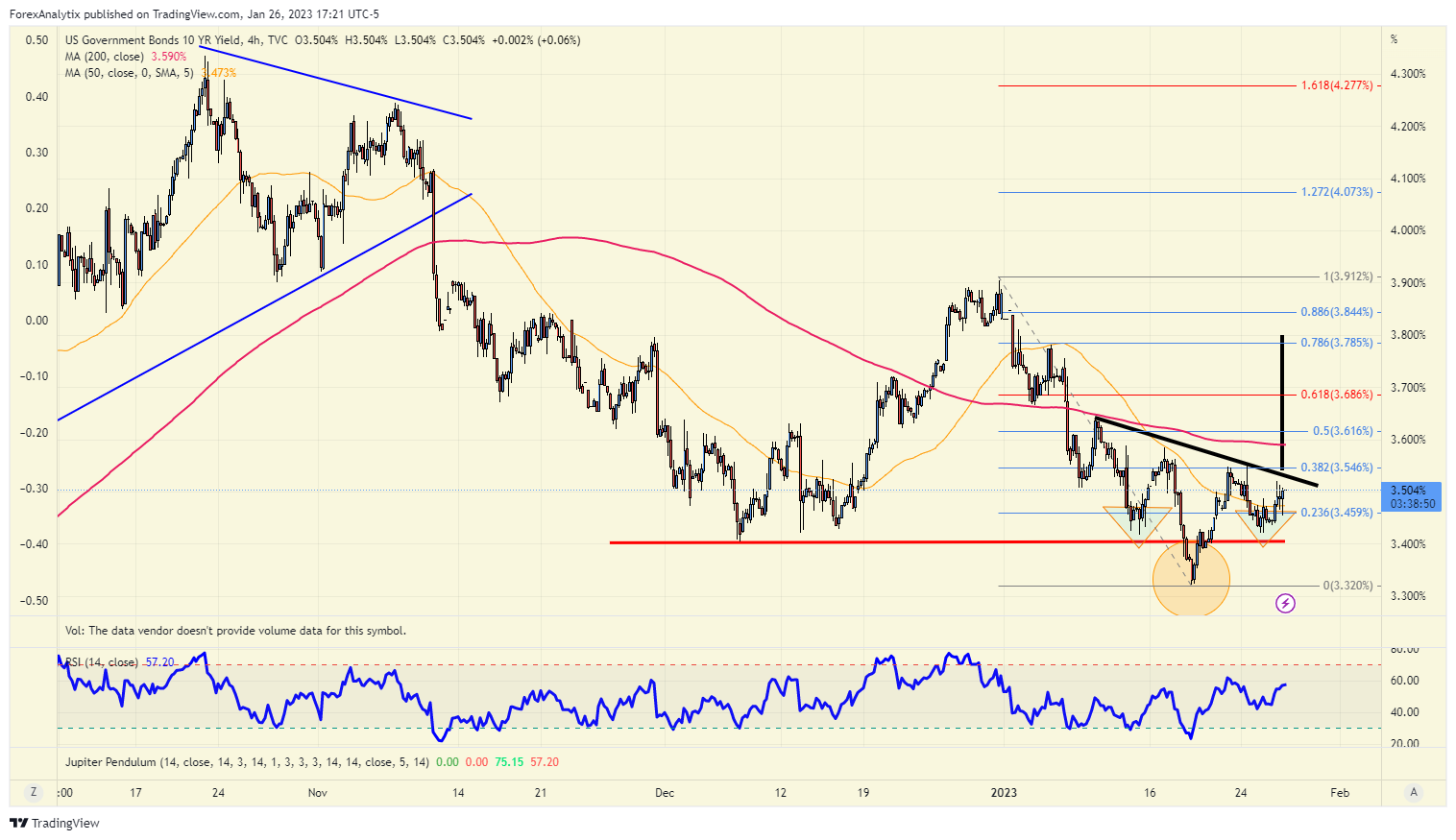 Forex Analytix社区(Grasshopper)的一名交易员指出,10年期美国国债收益率正在形成一个倒转头肩形态,这可能会导致该收益率在短期内向上突破。考虑到上周1月19日发生在水平支撑位下方的假突破,这建立了头部的情况。突破3.53%的颈缐可能会导致该收益率在未来几周向3.80上升。收益率上升也可能是美元空头的一个警告信号。