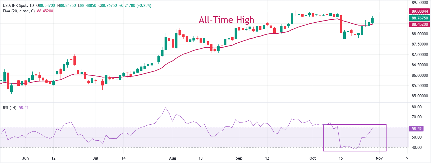 技术分析:美元/印度卢比旨在重返约89.10的历史高点