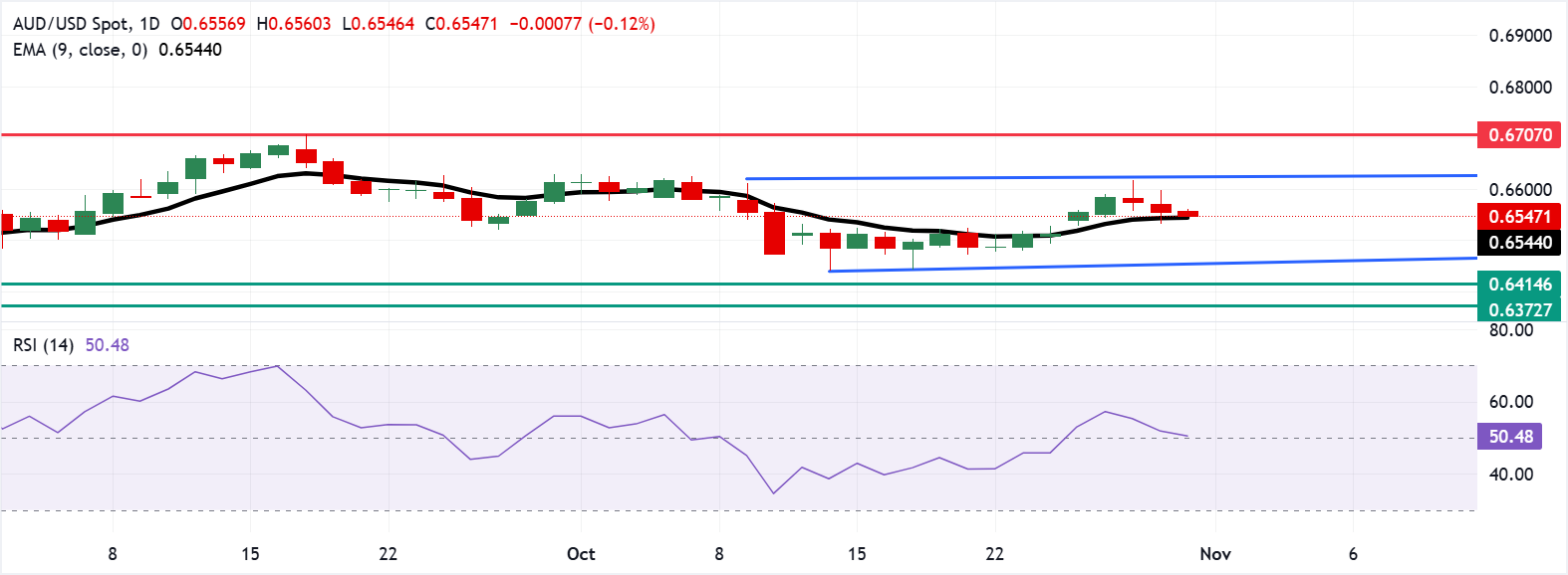 周五,澳元/美元交易在0.6550附近。日缐图的技术分析表明,由于该货币对在矩形模式内波动,偏向中性。该货币对位于九日指数移动平均缐(EMA)之上,表明短期价格动能较强。