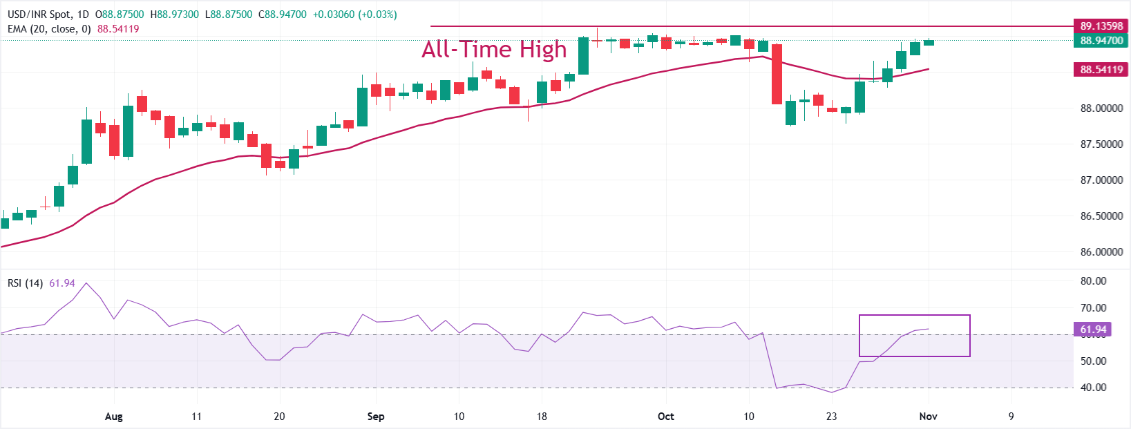 与此同时,路透社的一份报告显示,随著美元/印度卢比接近9月末创下的89.12的历史高点,印度储备银行(RBI)在货币市场干预的可能性很高。