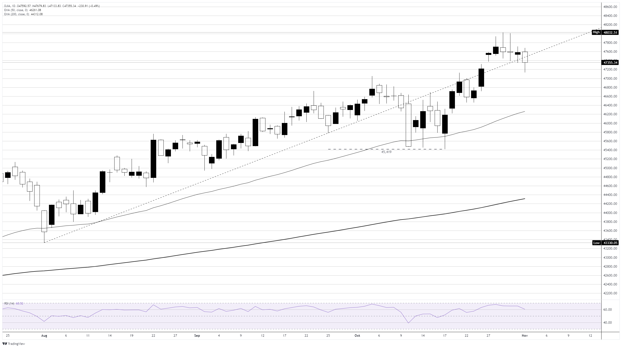 道琼斯工业平均指数(DJIA)周一面临新一轮下跌,以200点的跌幅𫔭啟新交易周。道琼斯指数短暂测试至47,250以下,这是超过一周以来的首次,因為"壮丽七"集中投资收益推动其他指数上涨。