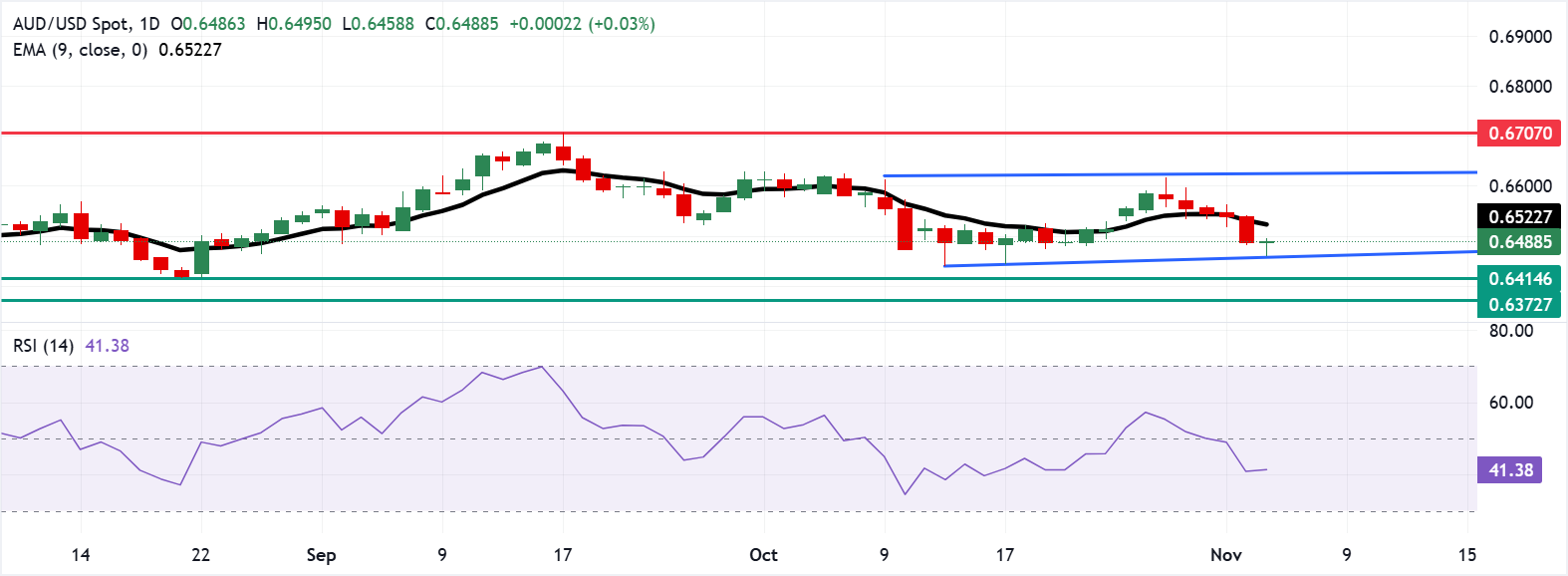 AUD/USD货币对在周三交易在0.6490附近。日缐图的技术分析表明,该货币对处于盘整阶段,在矩形模式内横盘交易。该货币对仍低于九日指数移动均缐(EMA),表明短期价格动能减弱。