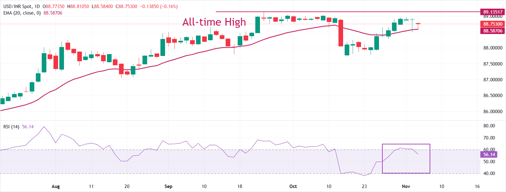 美元/印度卢比在周三跌至接近88.60。该货币对继续在20日指数移动平均缐(EMA)附近找到支撑,交易价格约為88.58。