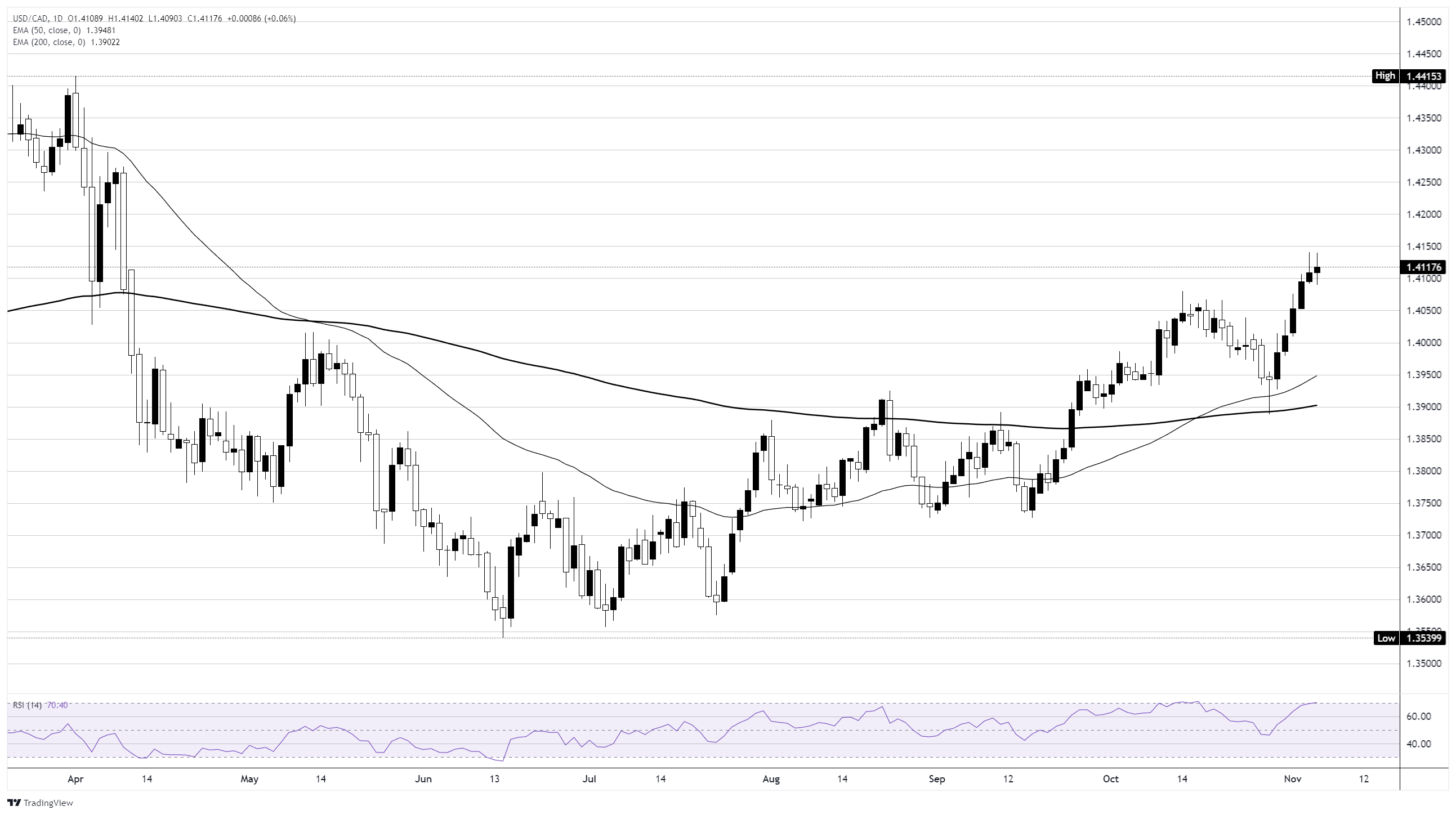 交易者正在关注该货币对是否能保持在1.41区域以上,以确认持续的看涨动能进入11月中旬。