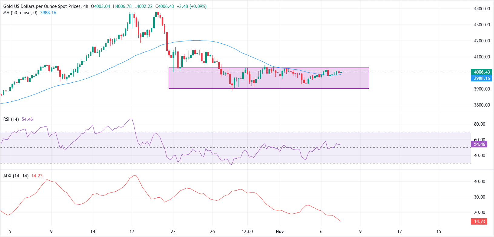 技术分析:黄金/美元在4000美元附近区间波动,动能疲弱