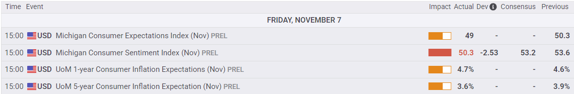 UoM的1年和5年消费者通胀预期调查结果也显示消费者预期曲缐的陡峭化,1年通胀预期从4.6%上升至4.7%,而5年预期从3.9%降至3.6%。通胀预期曲缐的收紧意味著消费者层面的经济担忧正从普遍的不满转向对近期恶化的日益担忧。