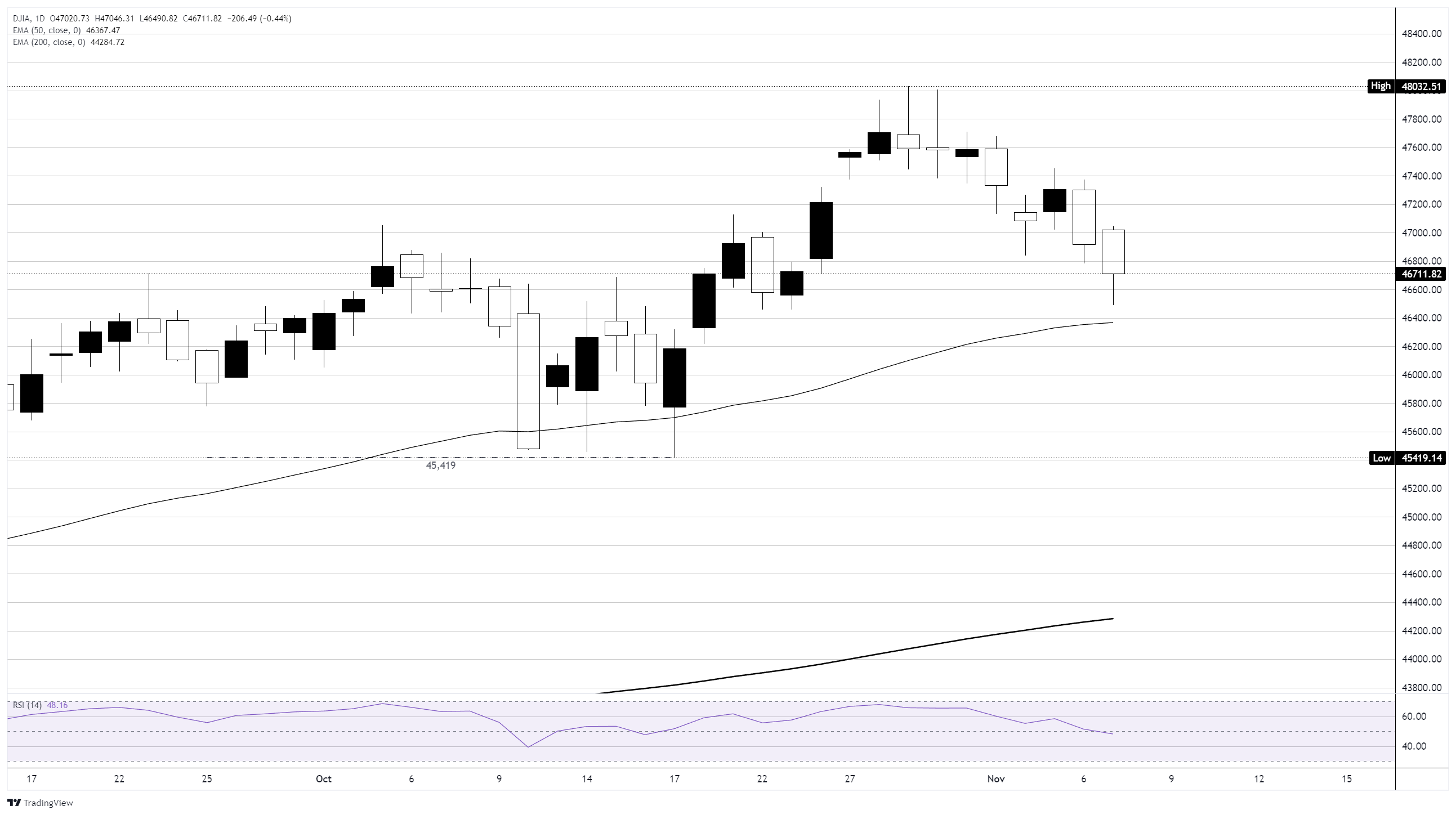 道琼斯工业平均指数(DJIA)周五再次下跌,首次测试46,800水平,距离近三周以来的最低点,因人工智慧股票回调和消费者调查结果疲软,拖累了投资与消费之间的关係。周五本应发布最新的美国非农就业人数(NFP)报告,但由于美国政府持续停摆,这一停摆已成為美国历史上最长的停摆,官方数据的流通受到限制,投资者不得不应对波动的私人数据,并对关键的通胀和就业数字产生深刻的疑问。