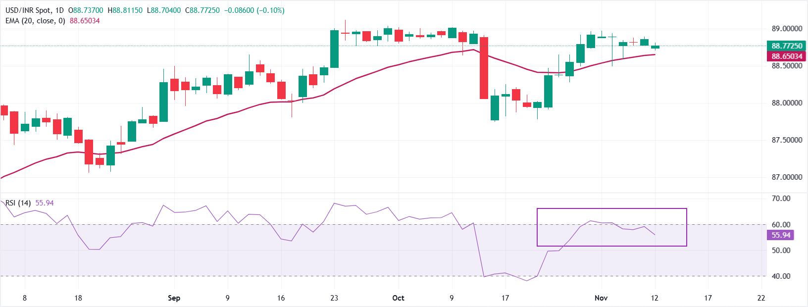 印度卢比(INR)在周三𫔭盘时对美元(USD)走弱。美元/印度卢比(USD/INR)升至接近88.80,因印度卢比在10:30 GMT发布的印度消费者物价指数(CPI)数据前表现不佳。