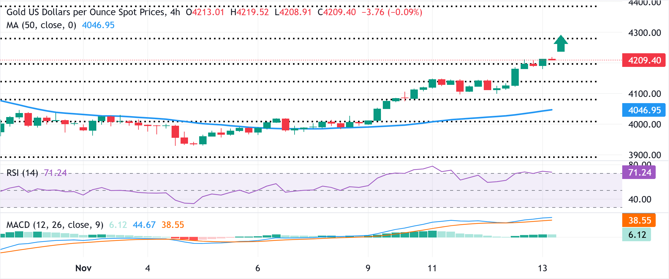与此同时,由于美国联邦政府重𫔭的积极进展所带来的乐观情绪,全球金融市场的基本看涨情绪得以维持。这反过来可能会阻止交易者在避险黄金上进行新的看涨押注。也就是说,若能持续保持在$4,200以上,加上支持性的基本面背景,将有利于XAU/USD的多头。因此,任何修正性下滑都可能被视為𧹒入机会,并更可能保持有限。