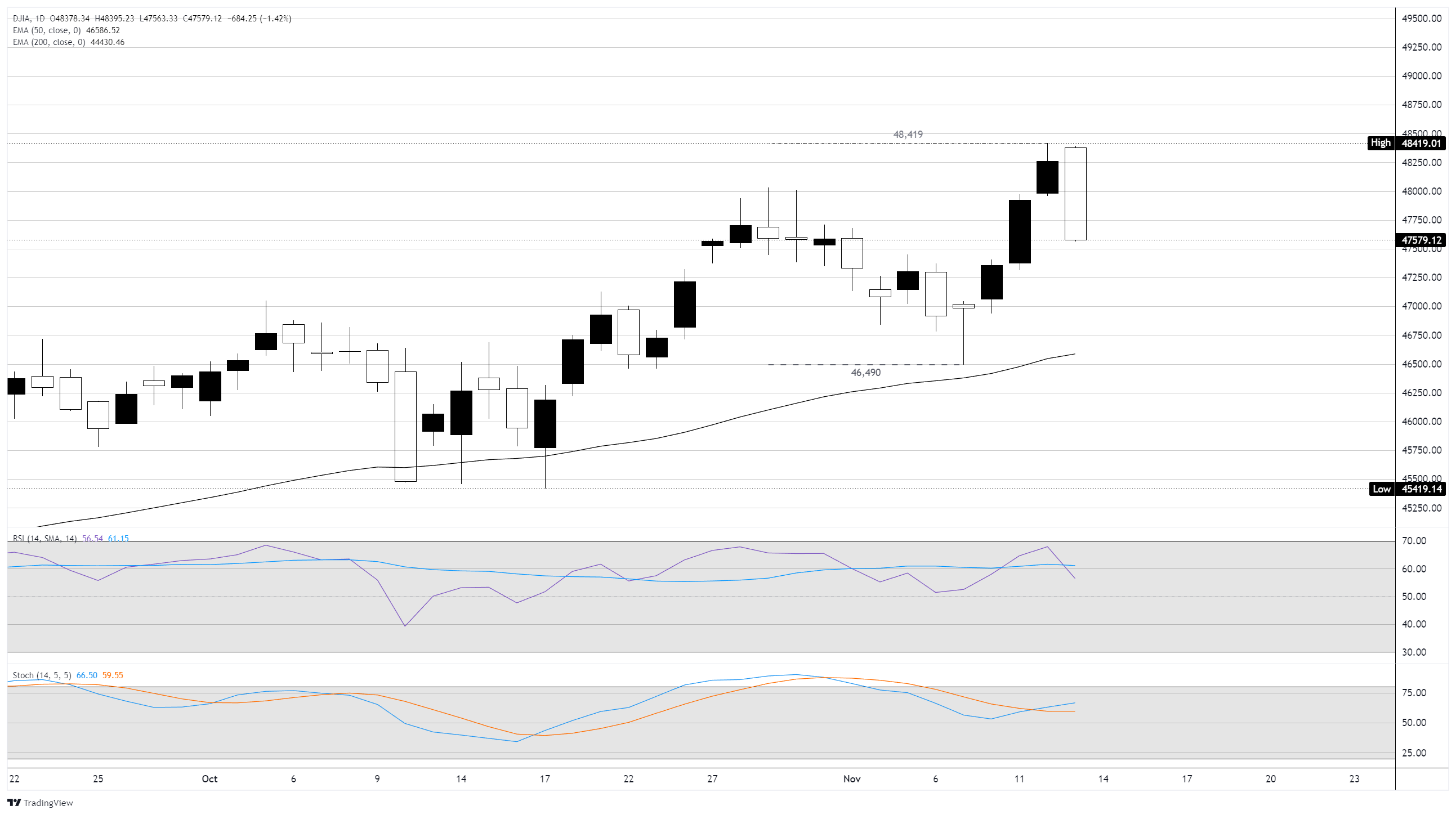 - 道琼斯指数在周四从历史高点回落,跌回48,000以下。