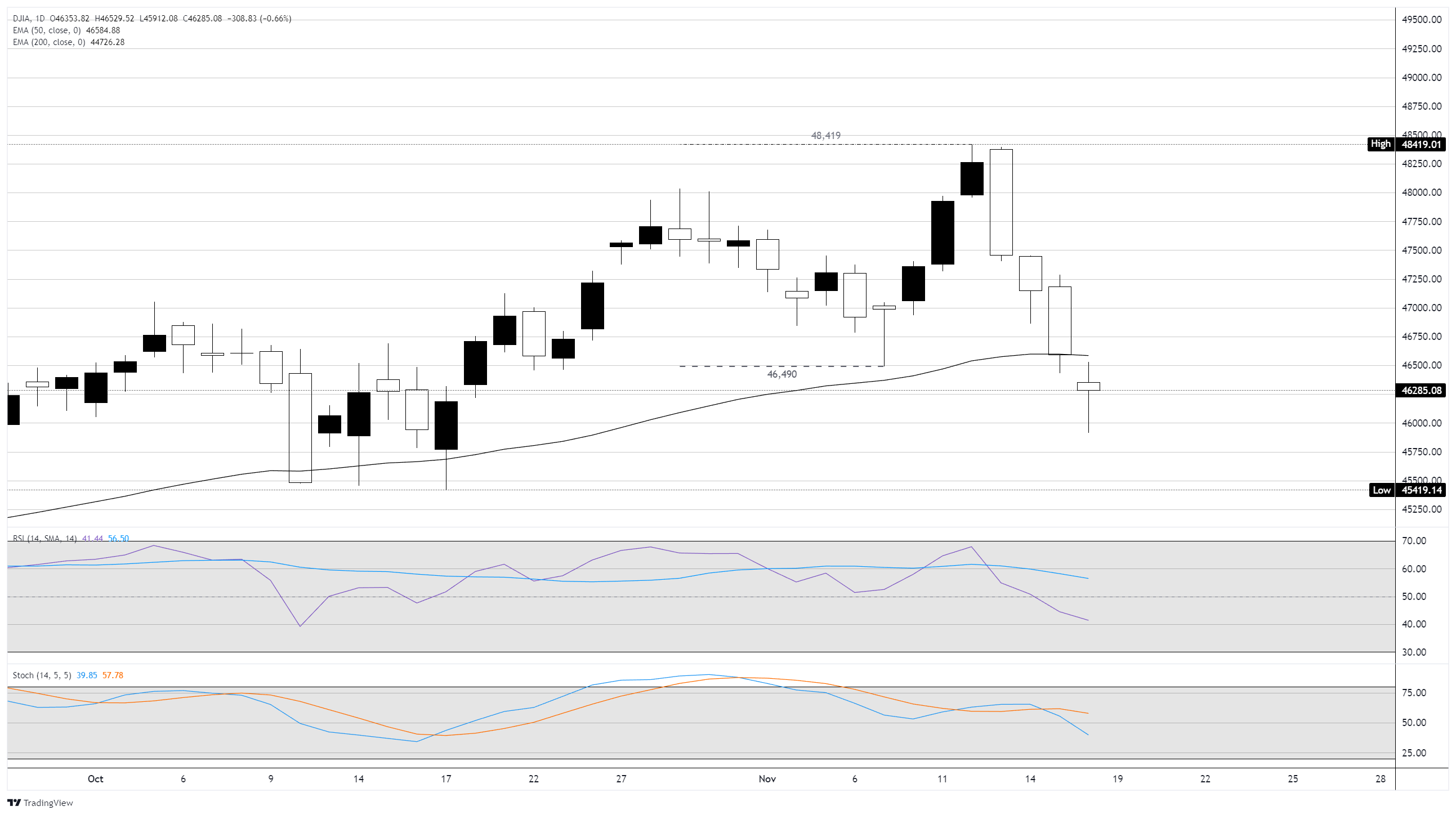 道琼斯工业平均指数在周二面临重新加大的下行压力,从前一天的收盘价下跌680点,最低触及46,255点后找到一个勉强的技术支撑位。主要股指已连续第四天走低,投资者在多个方面面临阻力。
