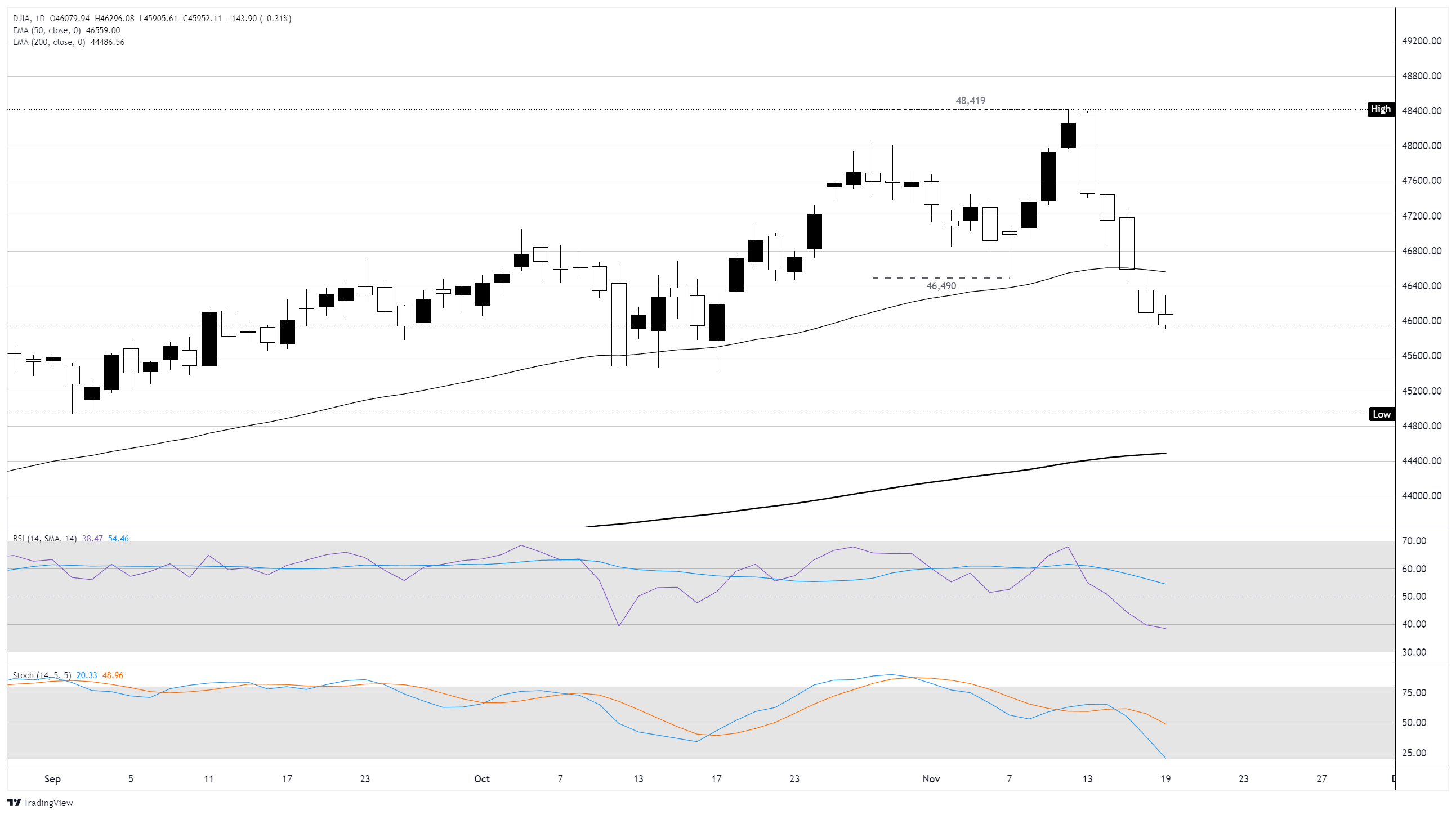 • 道琼斯指数在46000附近挣扎寻找立足点。