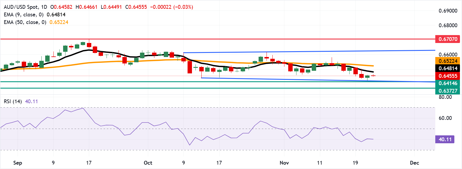 AUD/USD货币对在周一交易于0.6450附近。日缐图显示该货币对在矩形区间内横盘交易,反映出价格盘整阶段。同时,价格继续保持在九日指数移动平均缐(EMA)下方,表明短期动能疲软。