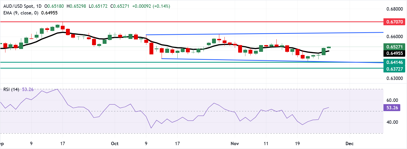 周四,AUD/USD货币对交易在0.6530附近。日缐图分析显示,该货币对保持在一个矩形盘整区间内,表明中性偏向。该货币对已突破九日指数移动平均缐(EMA),表明短期上行动能增强。
