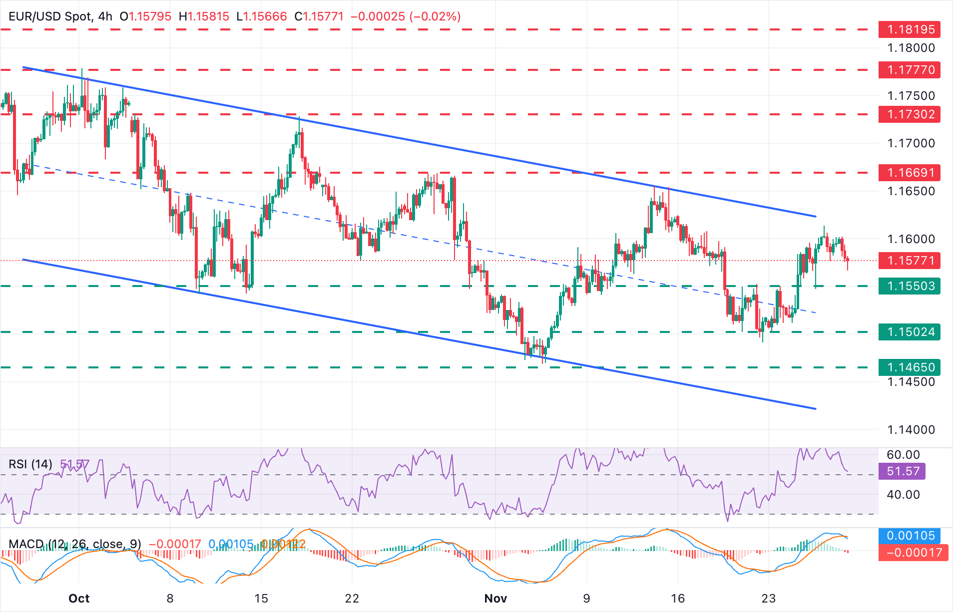 - 欧元兑美元在1.1600遭遇拒绝后,跌至接近1.1565的低点