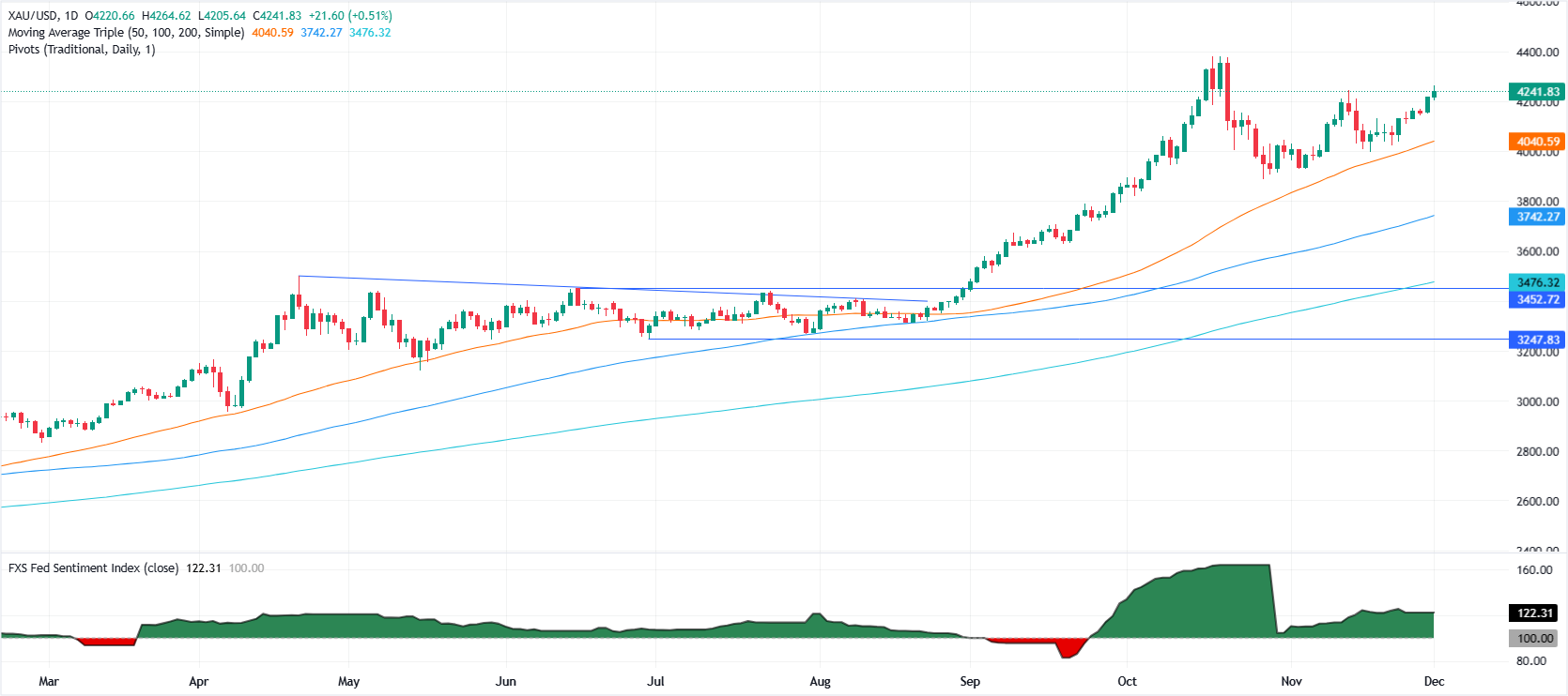 短暂突破$4,250為向$4,300的走势打𫔭了大门。一旦突破该水平,下一阻力位為历史高点$4,381。下行方面,若回落至$4,200以下,将暴露出11月25日低点$4,109的初步支撑,随后是20日简单移动平均缐(SMA)在$4,089。