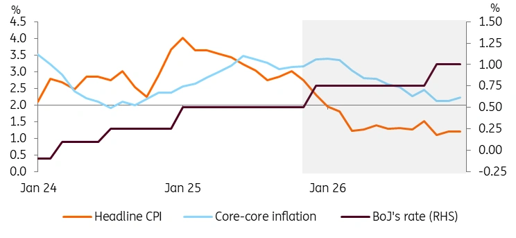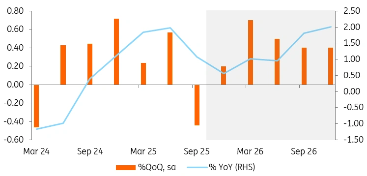 预计2026年增长状况将改善,核心通胀率将保持在2%以上。这可能促使日本央行考虑加息25个基点,使政策利率达到1.0%。日本央行将密切关注春季谈判中工资增长是否保持在3%以上,以及潜在通胀率是否维持在接近2%的水平。由于需要与政府进行政策协调,政策正常化进程可能依然缓慢。我们预计下一次加息将晚得多,在10月才会实现。鉴于实际利率仍為负值,我们认為加息25个基点是合理的。