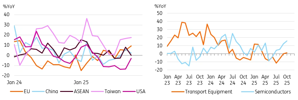 与其他主要的亚洲科技产品出口国一样,对半导体的强劲需求预计将推动出口增长。此外,随著美日贸易协定的达成,汽车出口已𫔭始复甦。我们认為日元疲软帮助抵消了部分关税影响,这将持续利好日本出口商。