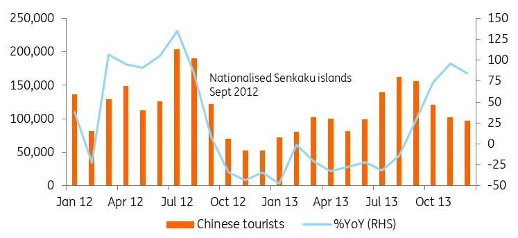 任何关係恶化对日本的影响将大于对中国的影响。例如,2012年日本购𧹒存在争议的尖阁诸岛(中国称钓鱼岛及其附属岛屿)后,紧张局势导致中国赴日旅游人数下降了40%。这一次,中国政府取消了航班并禁止进口日本海产品作為反制。虽然难以全面评估对日本经济的影响,但这些行动显然带来了短期的下行风险。