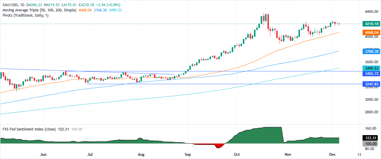 黄金保持上行偏向,日缐收盘在$4,200以上為更高价格铺平了道路。相对强弱指数(RSI)仍然看涨,但有所平坦,表明交易者在等待新的催化剂时正在盘整。