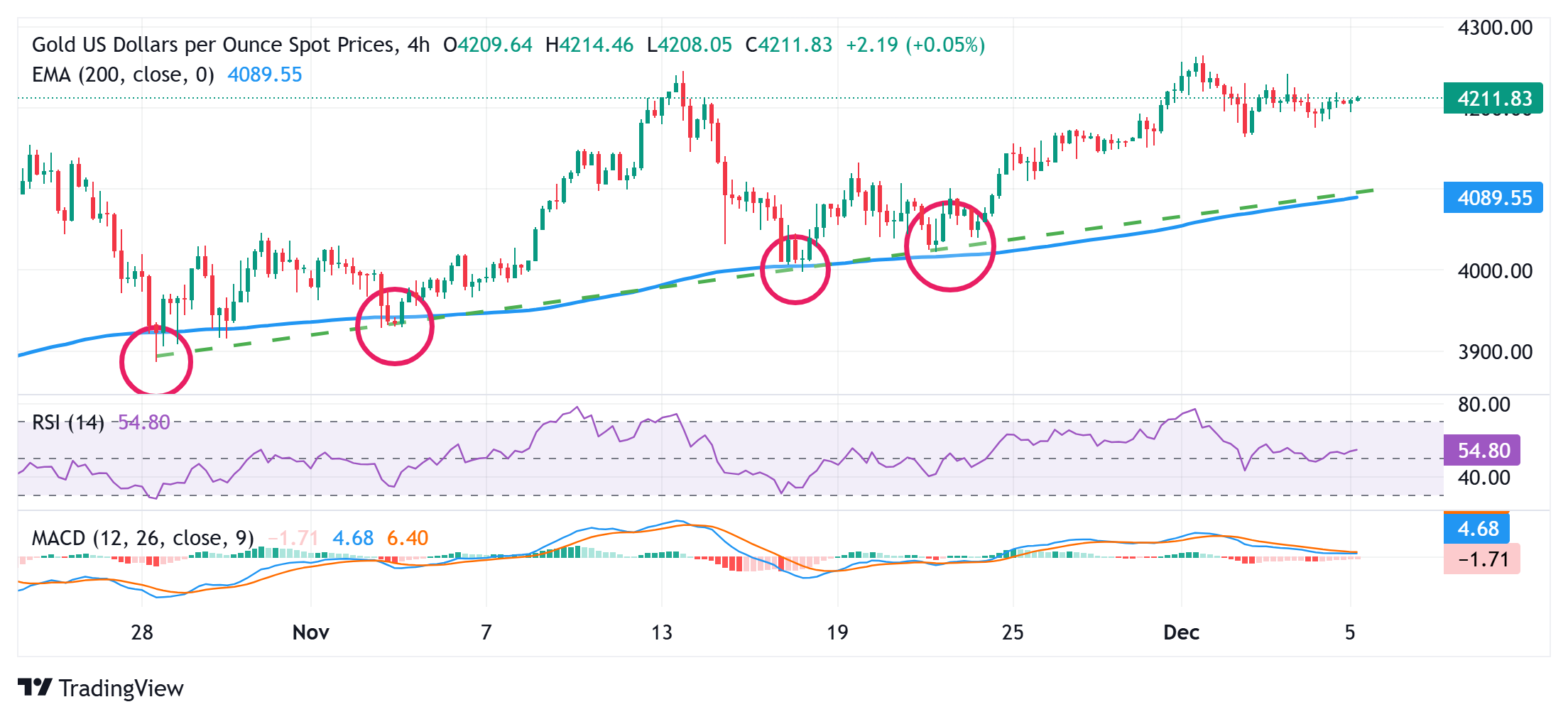 另一方面,向周低点(约4164-4163美元区域)的回调仍可能被视為𧹒入机会,并保持有限。然而,若有效跌破,可能会引发技术性卖盘,使黄金价格面临测试4100-4090美元的风险。后者包括4小时图上的200期指数移动平均缐(EMA)和自10月底以来的上升趋势缐,这反过来应為黄金(XAU/USD)对提供强有力的支撑。