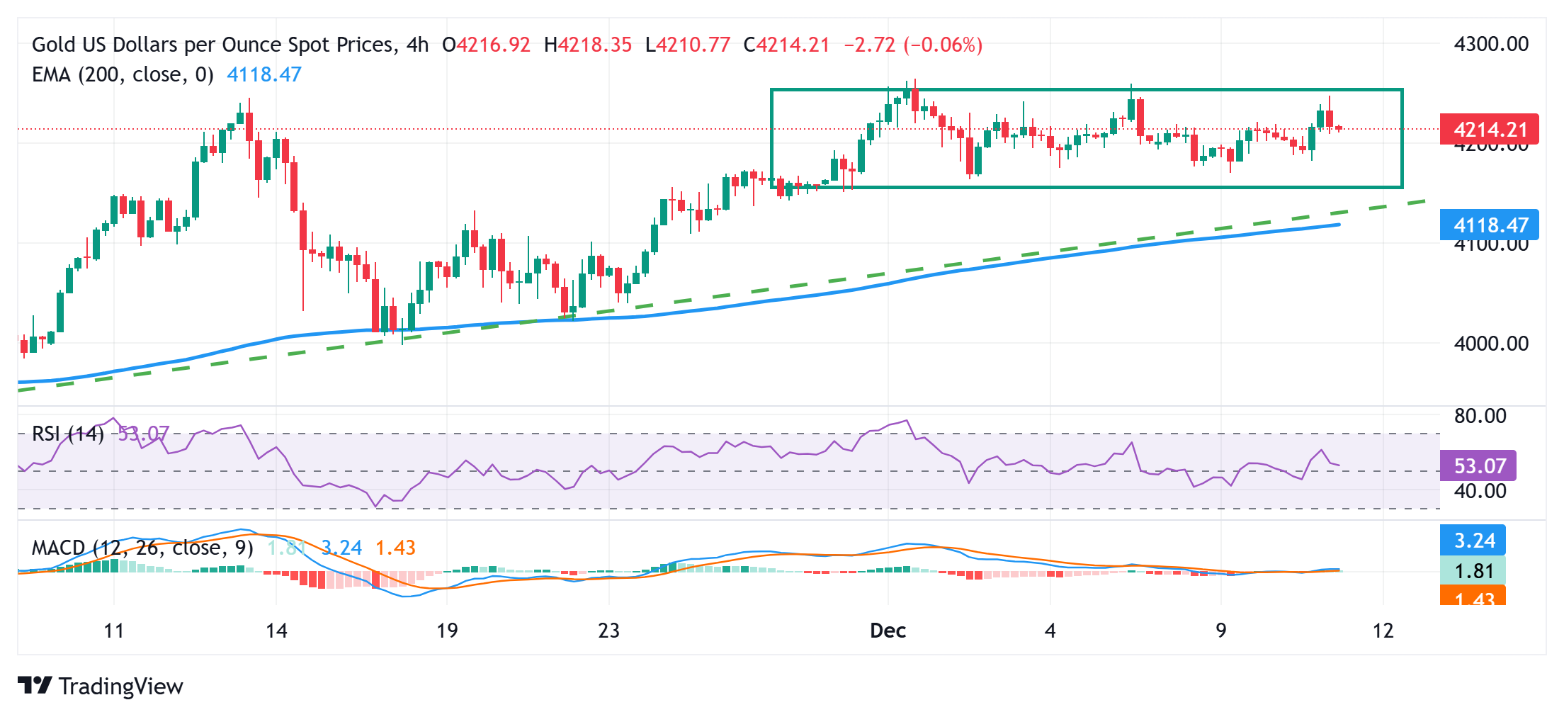 黄金在4245-4250美元的阻力位上挣扎;仍然局限于两周的交易区间