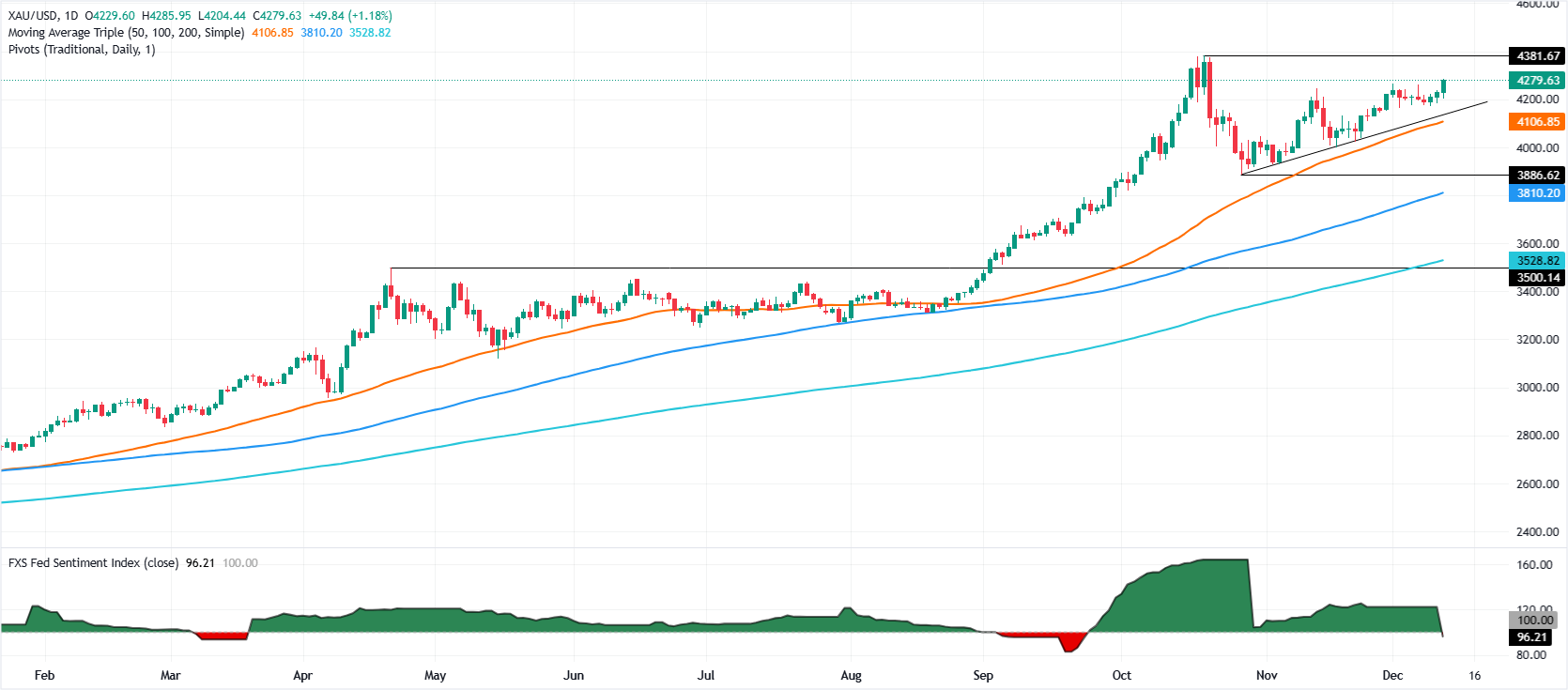 黄金(黄金/美元)在周四大幅上涨,此前美联储(Fed)在周三如预期降息,侭管暗示宽鬆周期可能暂停,但这并未成為贵金属上涨的藉口。截至发稿时,黄金/美元交易于$4,278,反弹自日低$4,204。