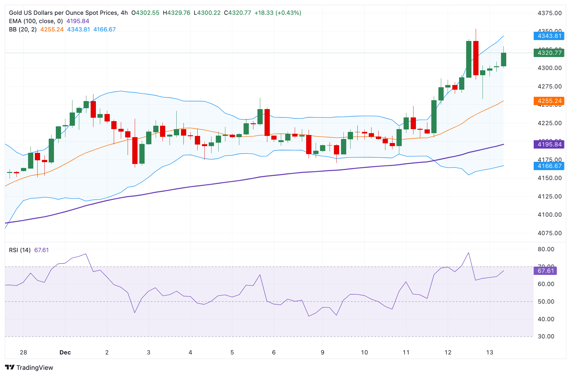 在下行方面,黄金的初始支撑位在12月12日的低点4257美元。更多看跌的蜡烛图反映出下行压力的持续,可能将价格拖至下一个看跌目标4200美元,即100日EMA。下一个争夺水平出现在4166美元,即布林带的下限。