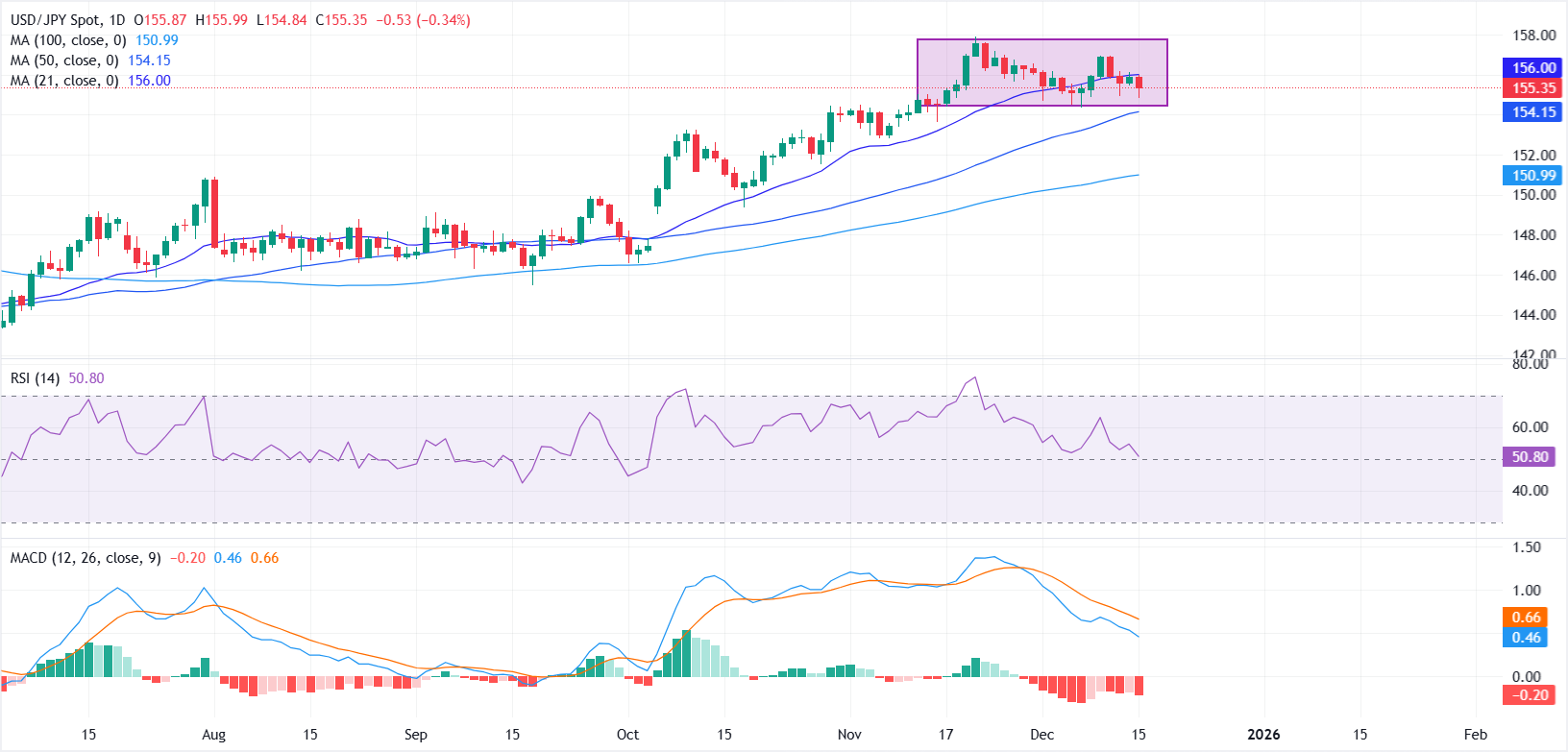 从技术角度来看,美元/日元在11月20日接近158.00水平时遭遇拒绝后,仍处于盘整阶段。该货币对目前徘徊在接近156.00的21日简单移动平均缐(SMA)下方,后者作為即时阻力位,限制了上涨尝试。需要在此水平上持续突破,以恢复看涨动能并暴露157.00-158.00区域。