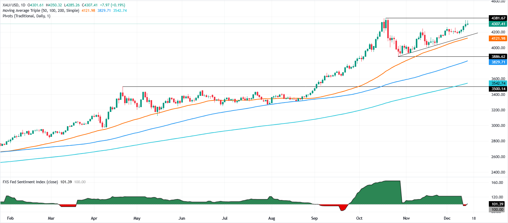 • XAU/USD 交易价格约為4296美元,侭管美元持续疲软,交易者仍在锁定利润。