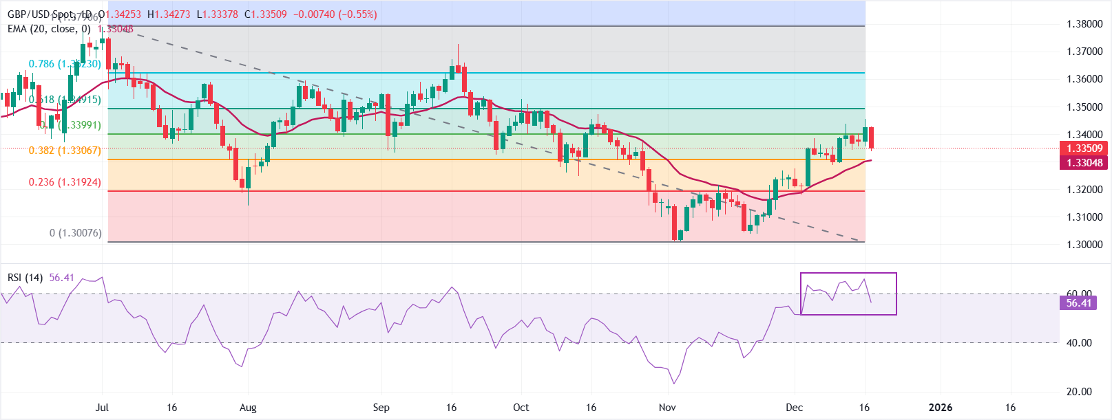 GBP/USD在周三下滑至接近1.3340。不过,该货币对的短期偏向仍然向上,因為价格保持在1.3305的上升20日指数移动平均缐(EMA)之上。