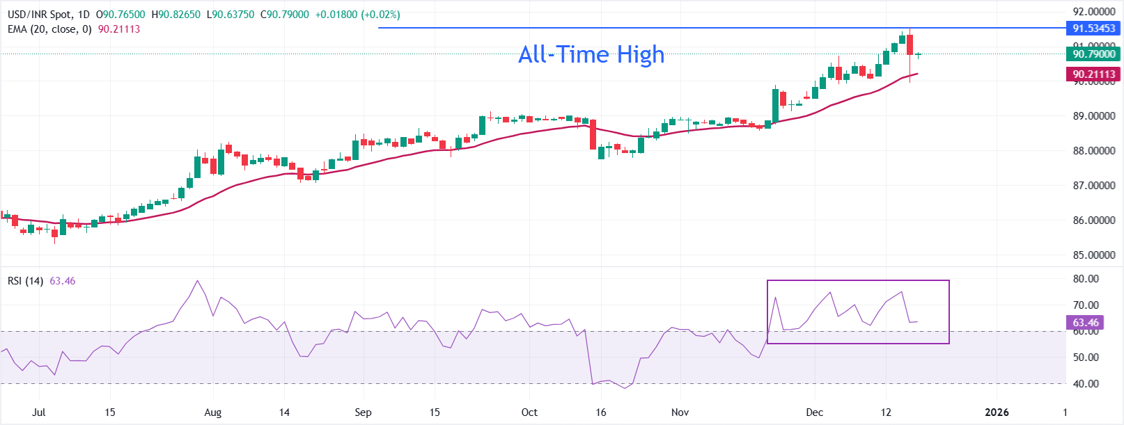 在日缐图上,美元/印度卢比交易于90.7840。该货币对保持在上升的20日指数移动平均缐(EMA)90.2106之上,保持上行偏向。该均缐继续向上倾斜,限制回调。相对强弱指数(RSI)在63.40,保持在看涨区域,确认了强劲的动能。