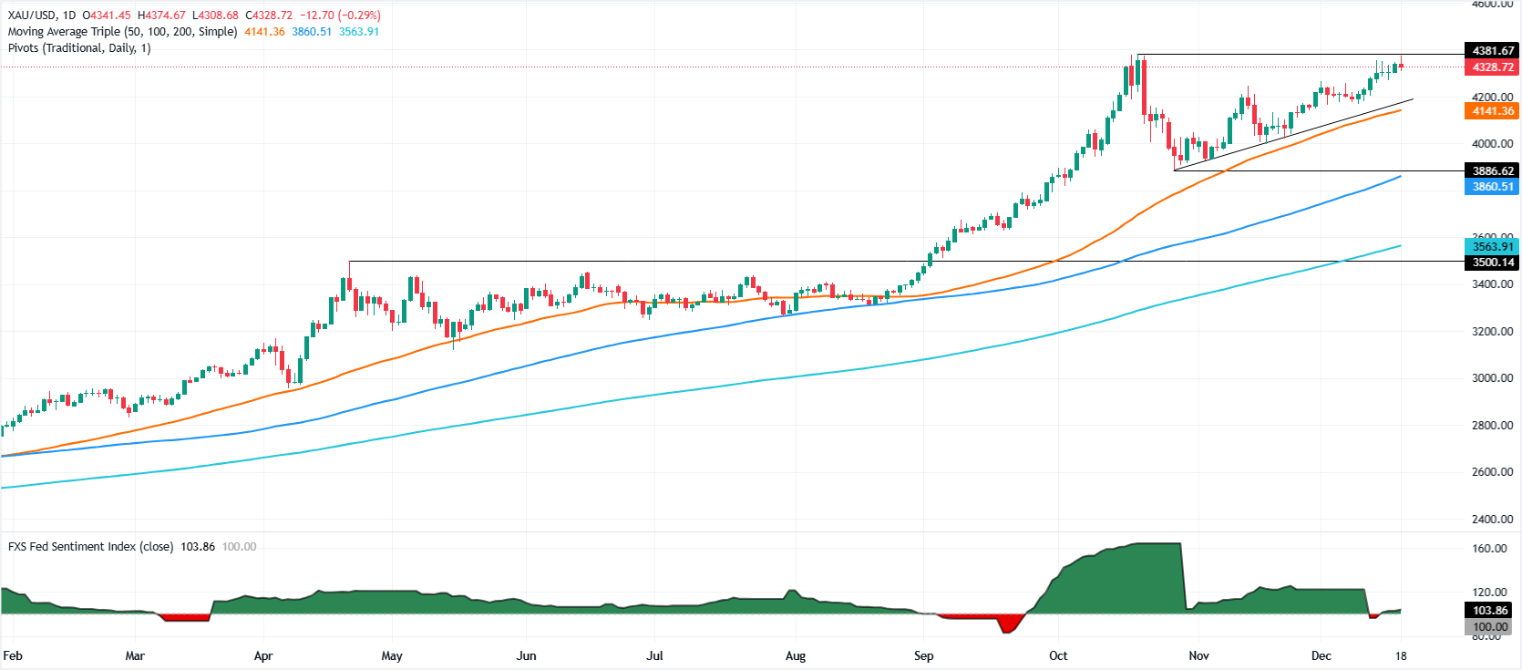 如果黄金/美元在日缐收盘时低于4,350美元,第一支撑位将是4,300美元。突破后者将暴露出12月11日的高点4,285美元,进一步支撑位在4,250美元,之后可能会向4,200美元的更深回调。