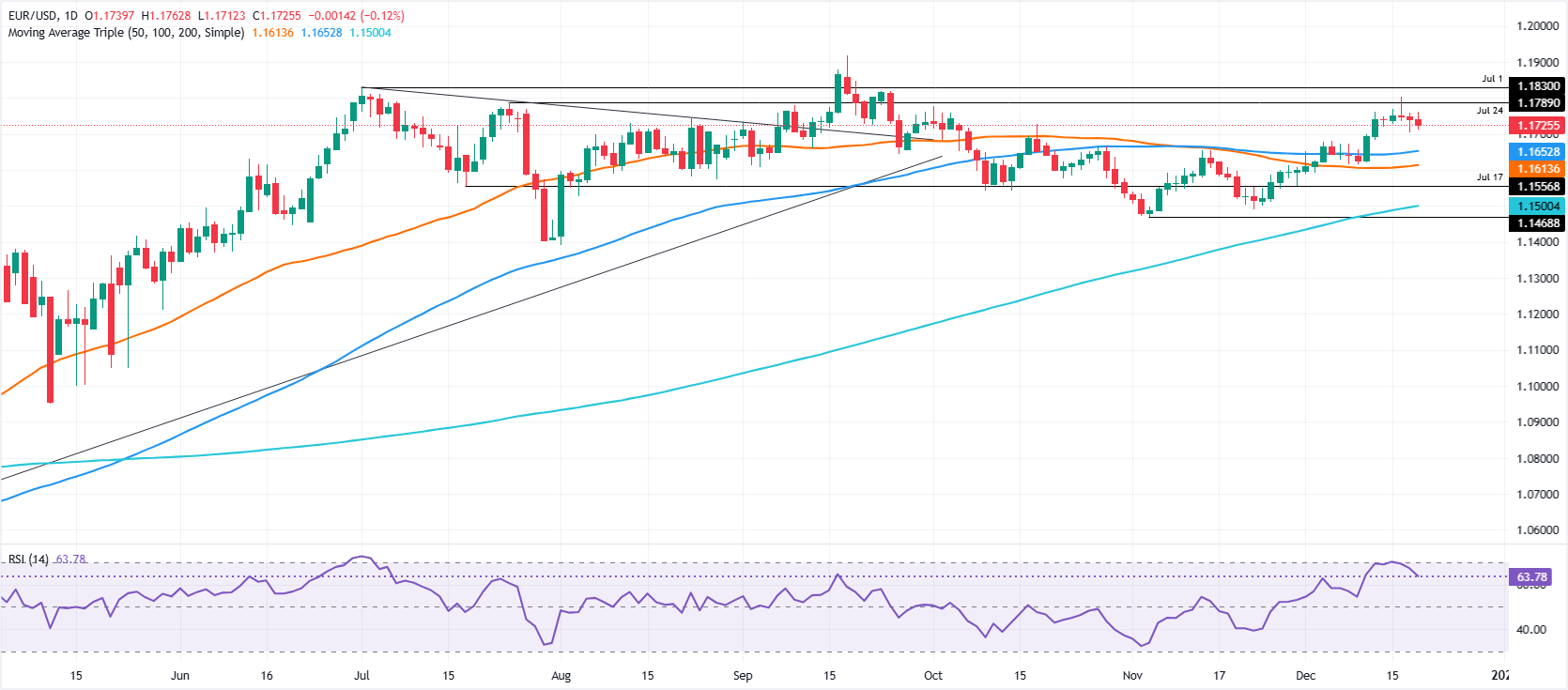 在大西洋两岸经济数据繁忙的背景下,欧元/美元在周四回落。美国的温和通胀数据和欧洲央行(ECB)在年内最后一次会议上维持利率不变,几乎没有对单一货币产生影响。截至发稿时,该货币对交易于1.1722,下跌0.16%。