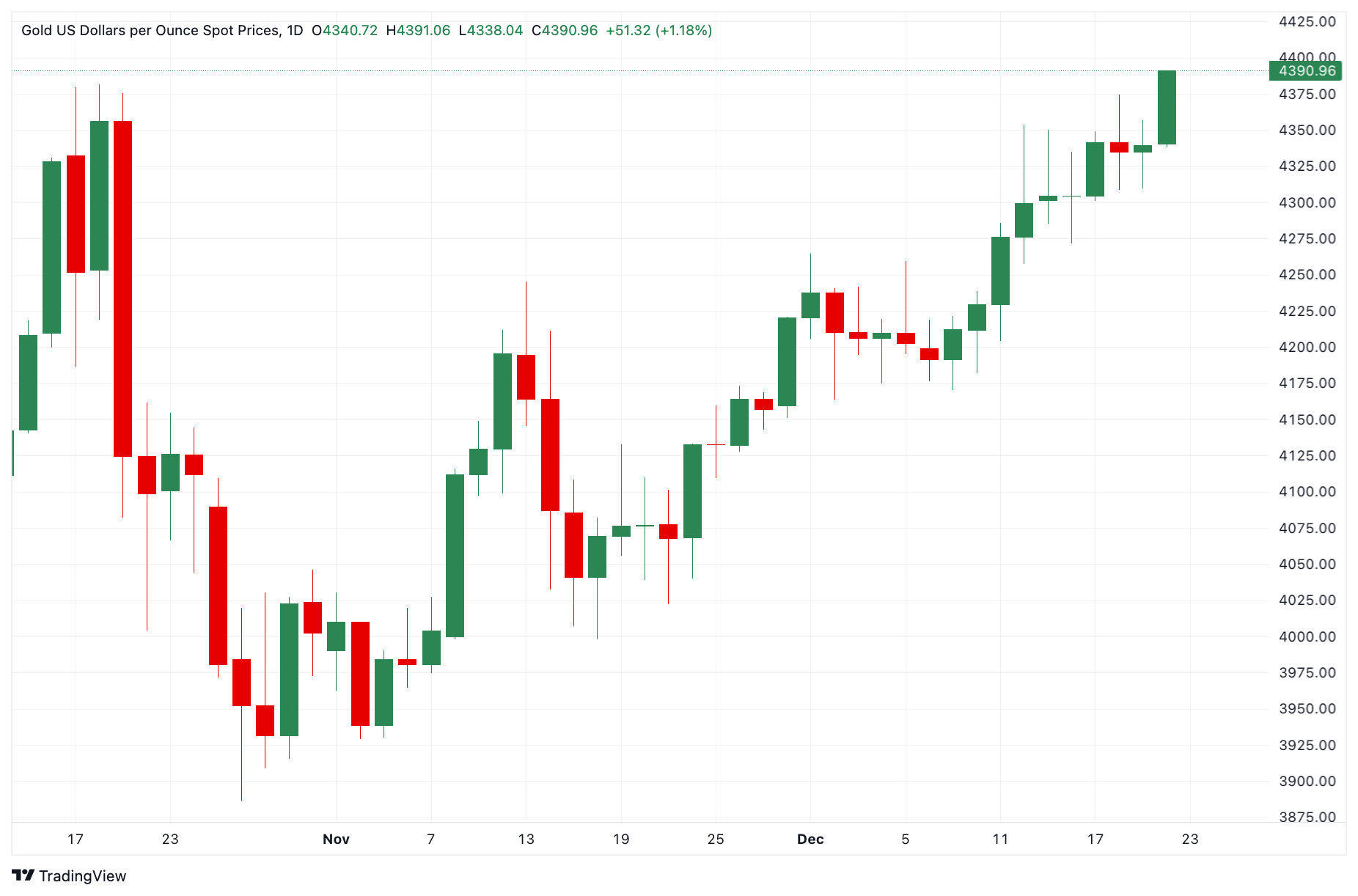 黄金因避险资金流入攀升至近4400美元的历史高位