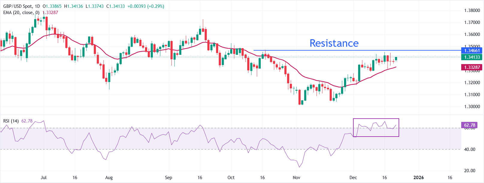 GBP/USD在周初交易于1.3415。20日指数移动平均缐(EMA)向上倾斜,强化了看涨偏向,因為价格明显高于平均缐。若持续保持在20日EMA(1.3329)之上,将保持上行前景。