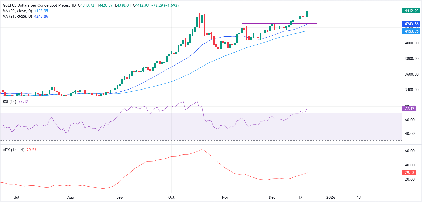 黄金(黄金/美元)周一飙升至创纪录新高,因地缘政治紧张局势加剧,推动避险需求。在撰写本文时,黄金/美元交投于4424美元附近,日内上涨约2%,突破了10月20日接近4381美元的高点。