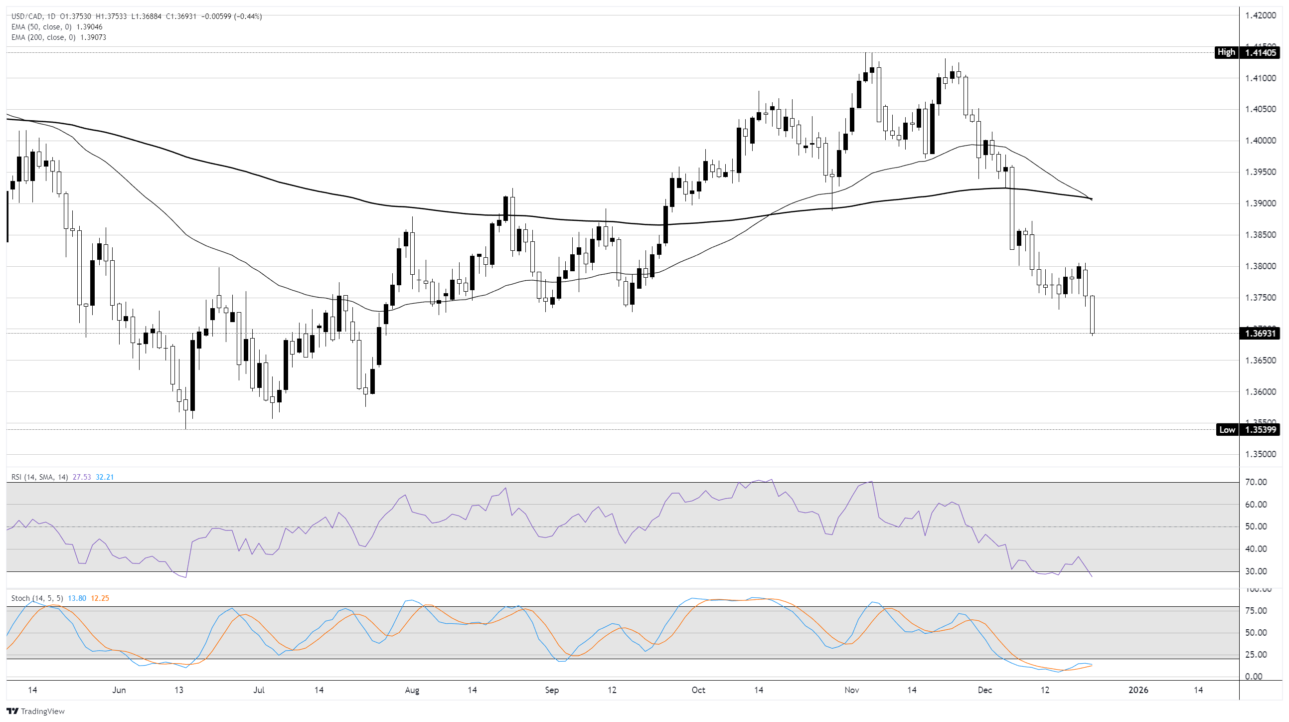 美元/加元日缐图显示,在其50日和200日移动平均缐下方明显突破后,出现了急剧的下行延伸,确认了短期动能向加元倾斜。价格从12月中旬接近1.41的高点加速下行,目前正向其近期区间的下端逼近,最新的蜡烛图反映出持续的卖压。然而,动能指标表明这一走势可能变得过度。相对强弱指数(RSI)已降至20多的高位,远低于通常与超卖条件相关的30阈值,而随机振盪器则深度抑制并𫔭始平坦,表明下行动能可能正在减弱。