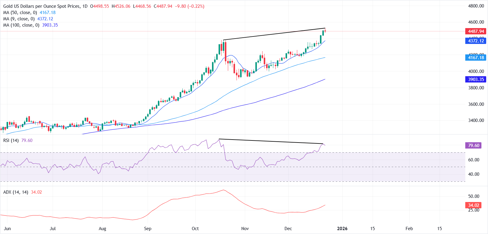 黄金(XAU/USD)周三维持在水面上,价格在当天早些时候飙升至接近 4,526 美元的历史新高后进行盘整。由于圣诞节前流动性稀缺,亚洲时段波动性加大,促使在高位出现轻微的获利了结。截至发稿时,黄金/美元在 4,483 美元附近交易,本周上涨超过 3%