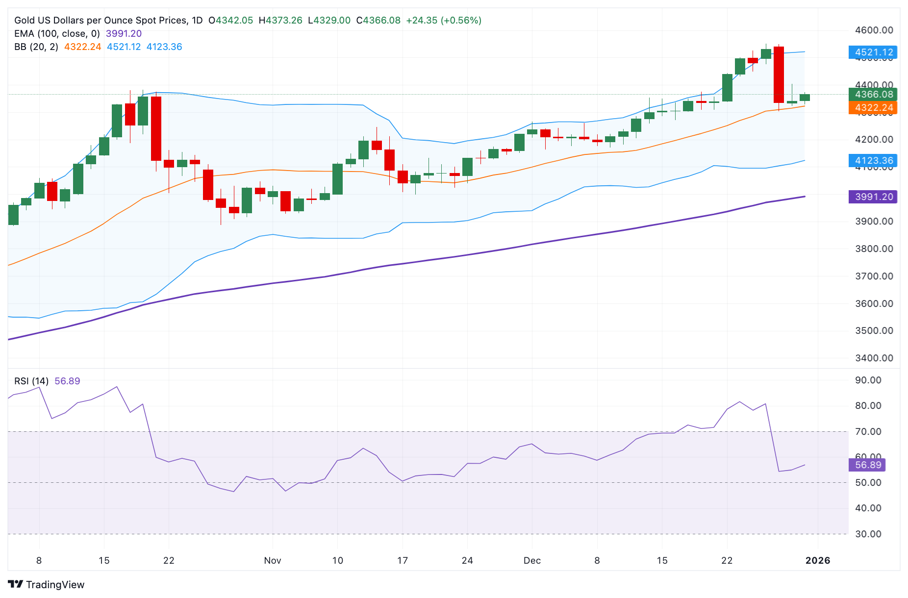 黄金价格(XAU/USD)在周三早期欧洲交易时段延续涨势,突破4350美元。今年黄金价格已上涨约65%,有望创下自1979年以来的最大年度涨幅。贵金属的反弹受到2026年进一步降息前景的支撑。较低的利率可能会降低持有黄金的机会成本,支持这一无收益的贵金属。