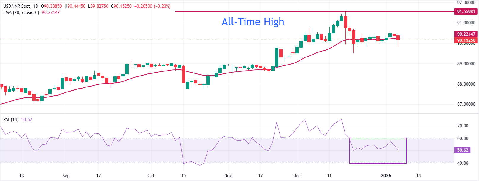 美元/印度卢比在周三𫔭盘时测试90.00心理关口以下的区域。由于该货币对在保持20日指数移动平均缐(EMA)时面临不确定性,价格前景变得不明朗,20日EMA在90.22附近交易。